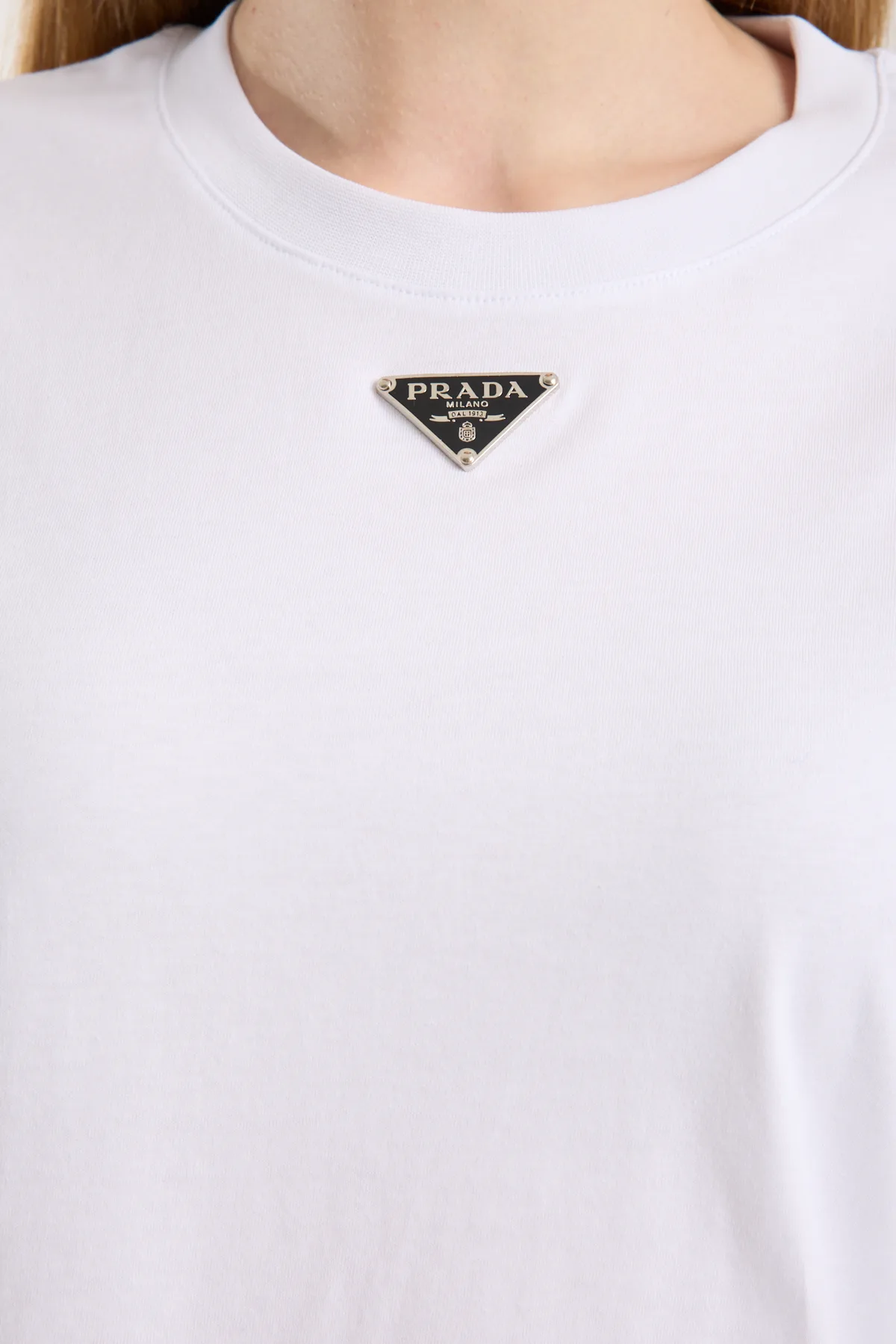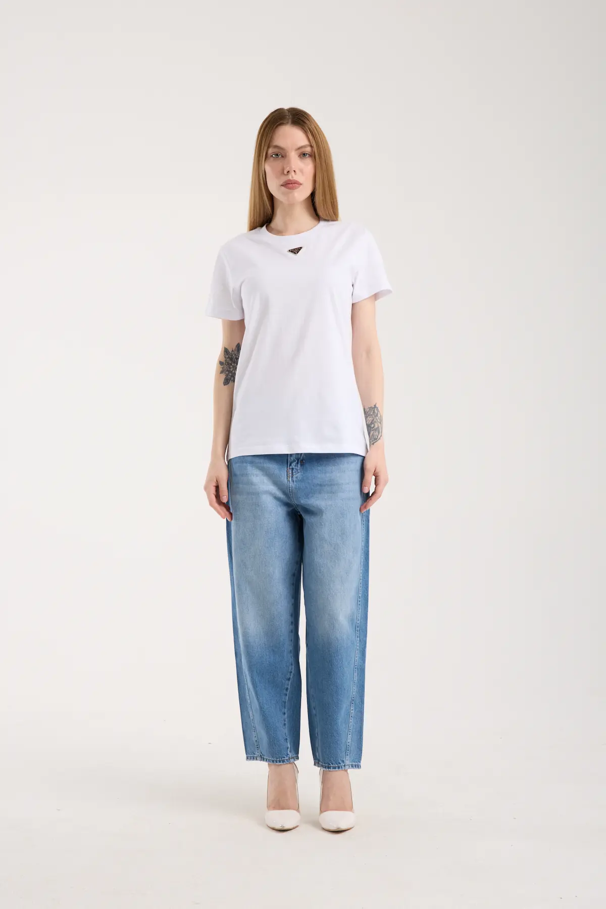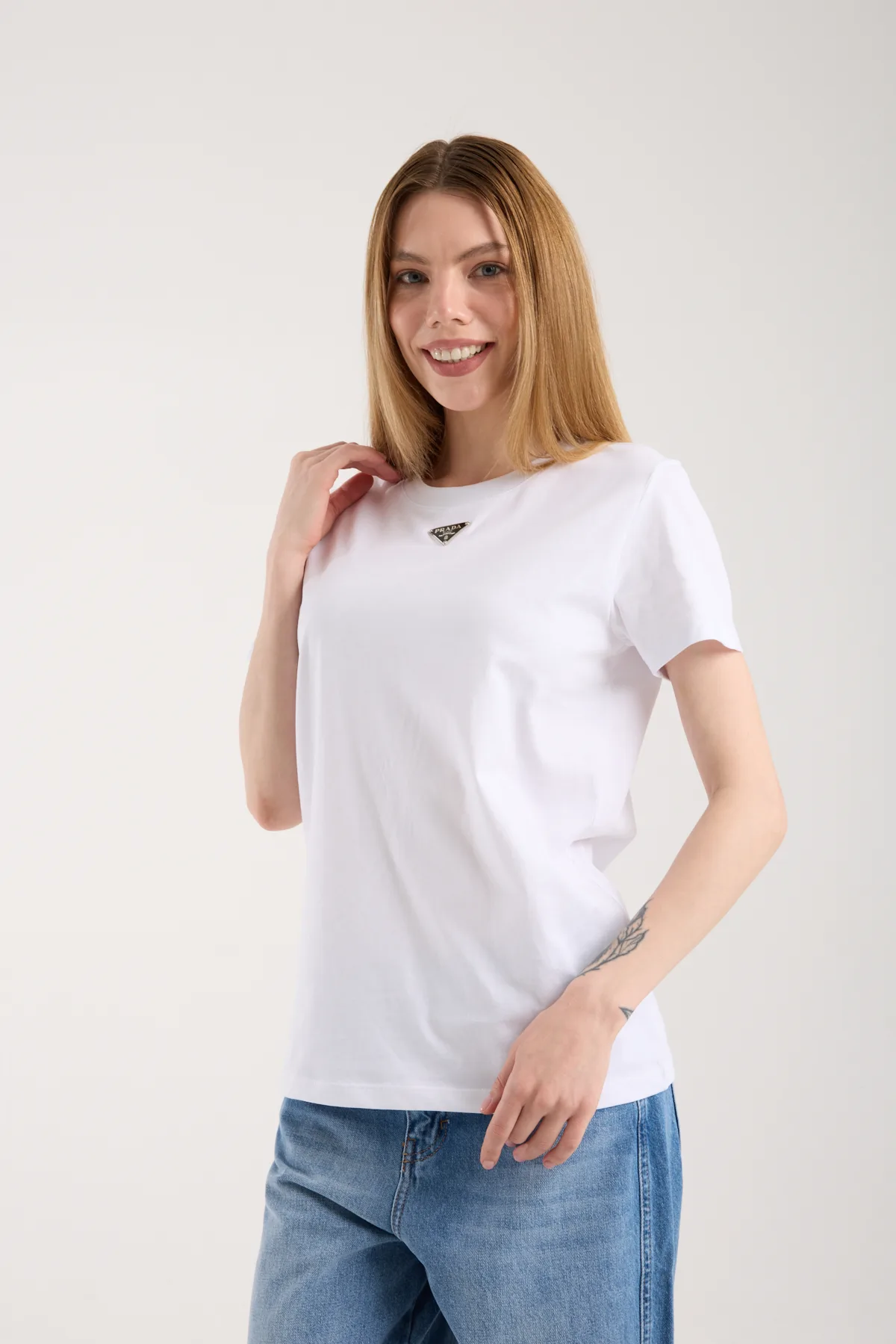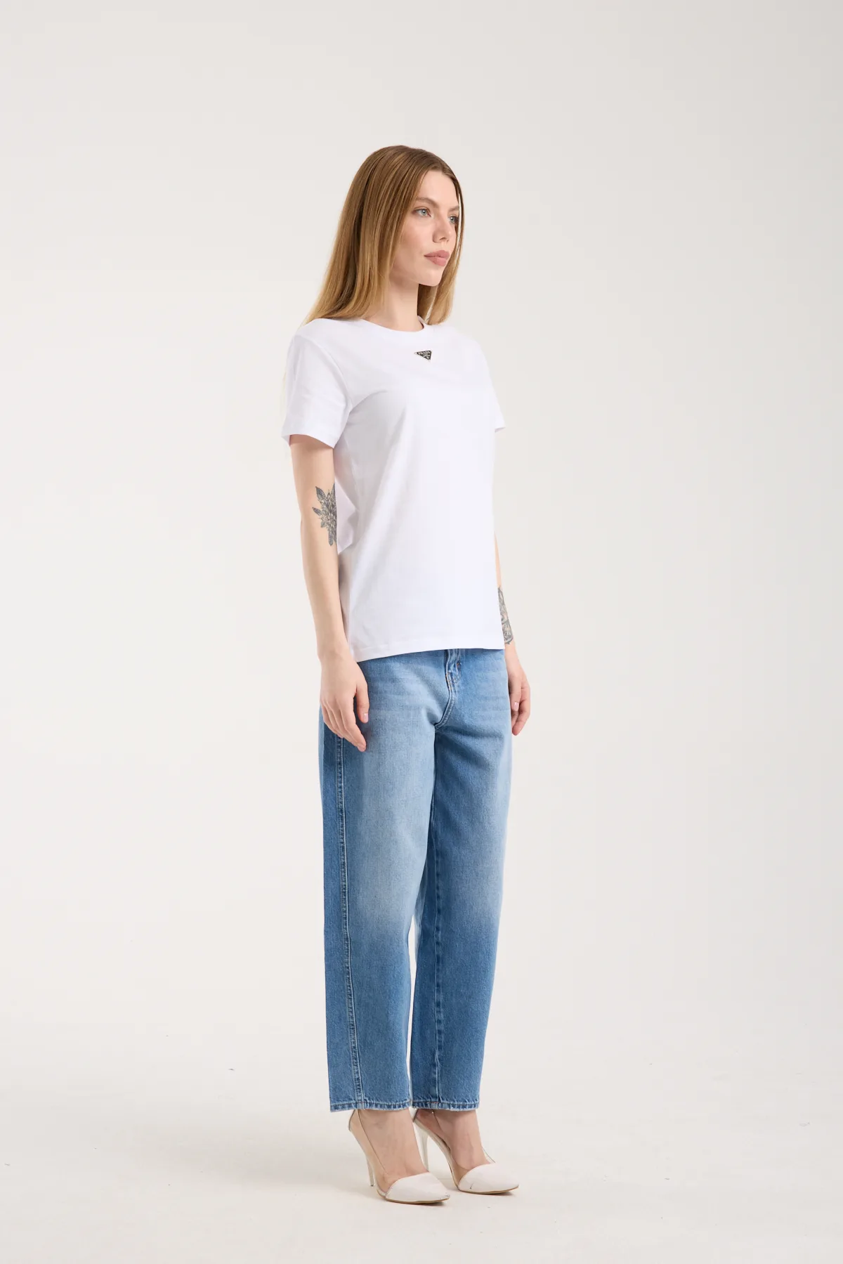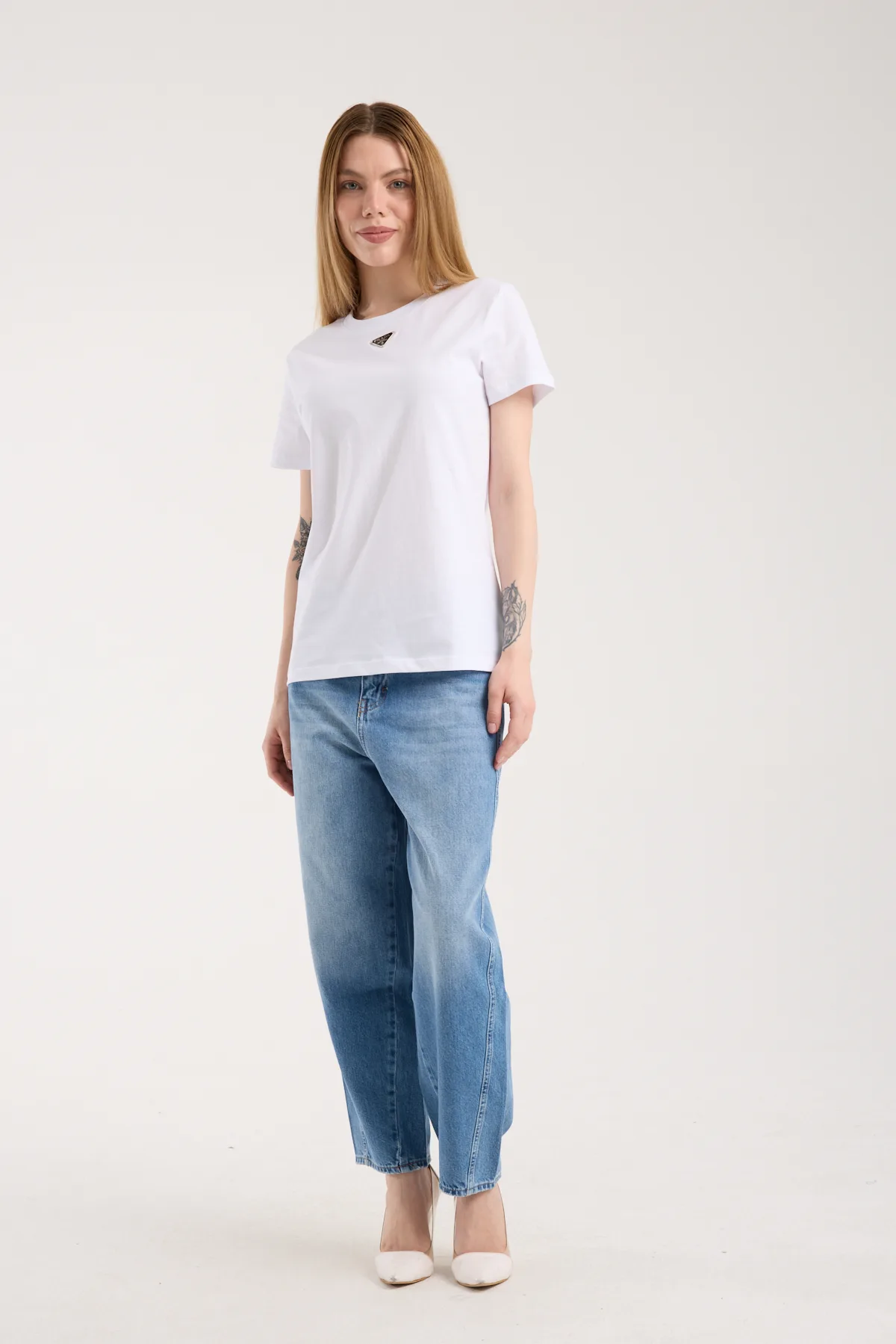 Bisiklet yaka, logo nakış işlemeli t-shirt.