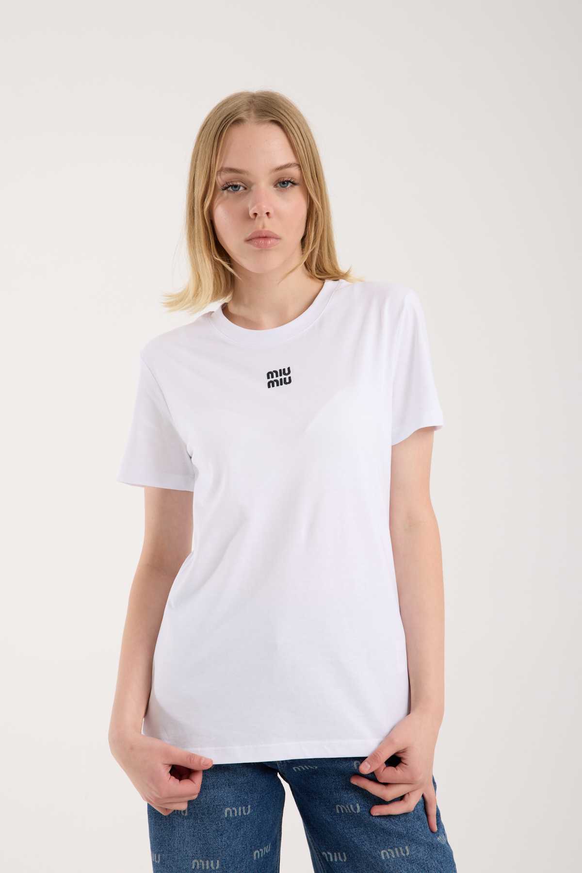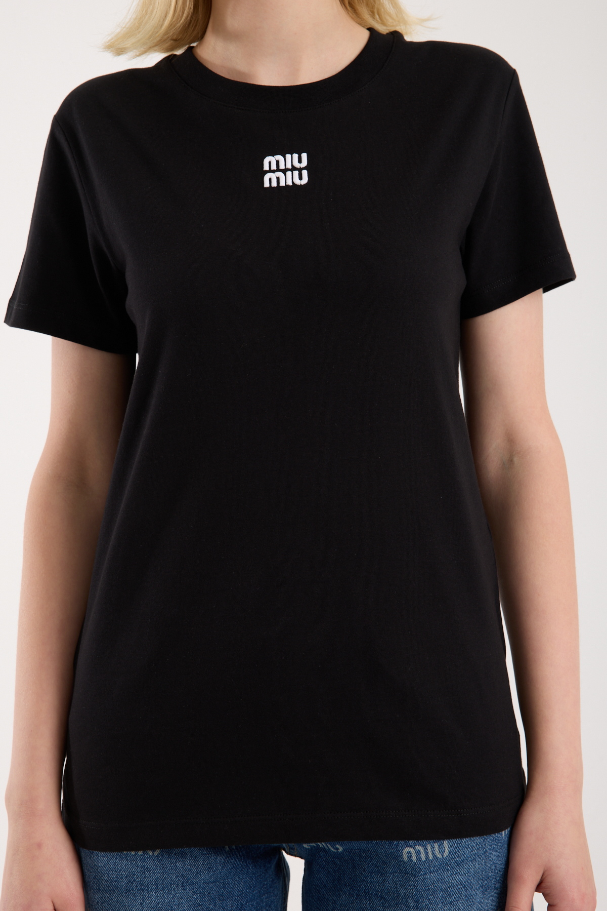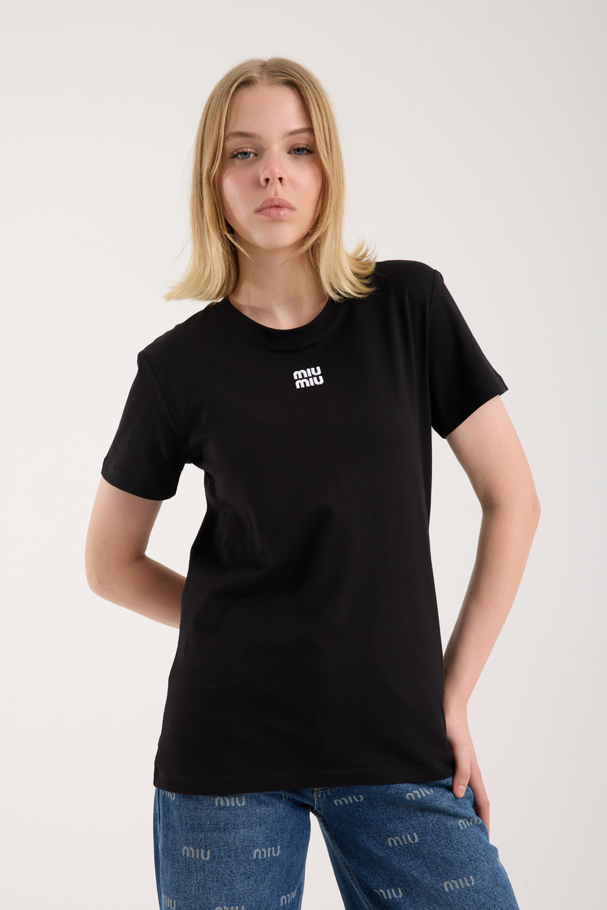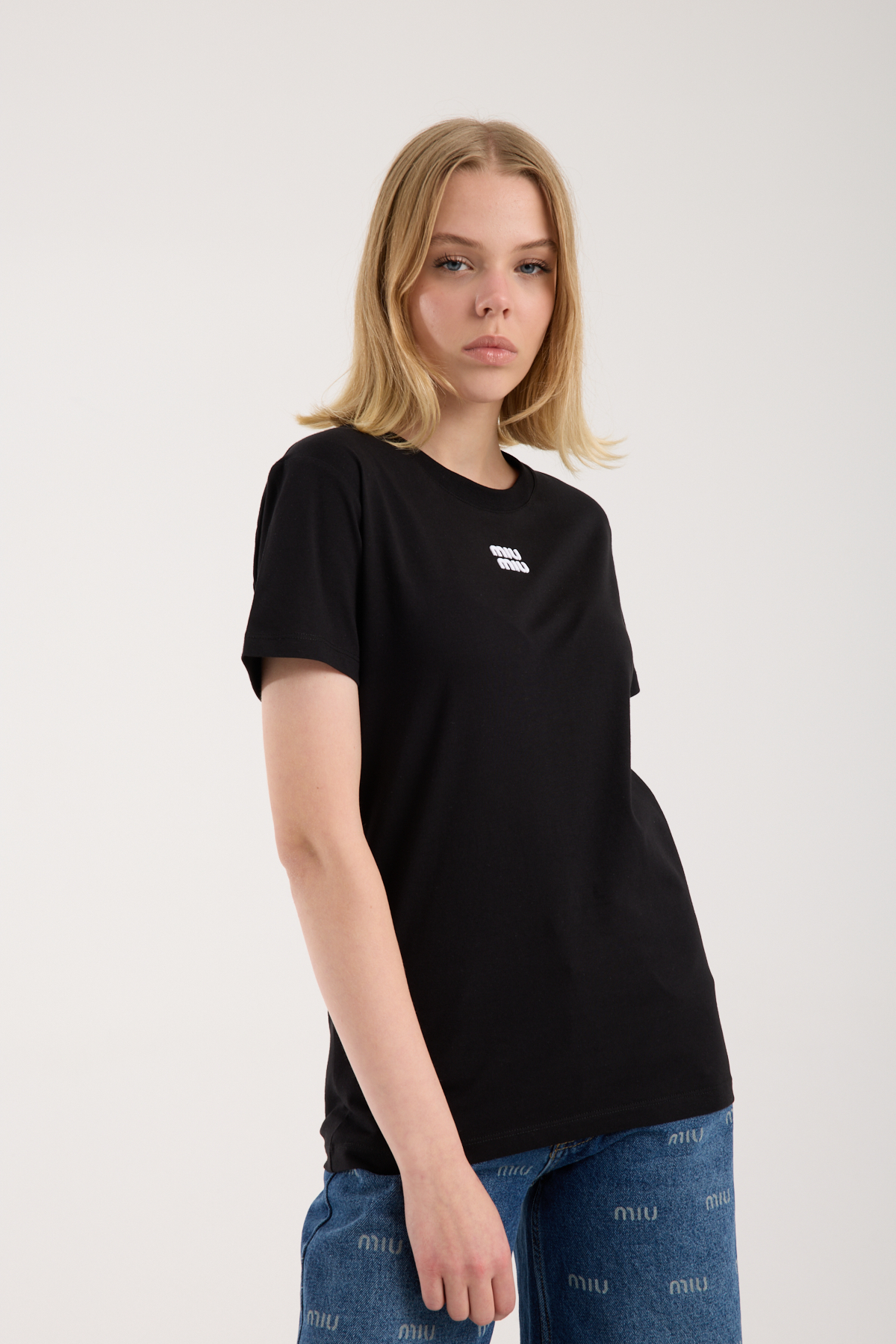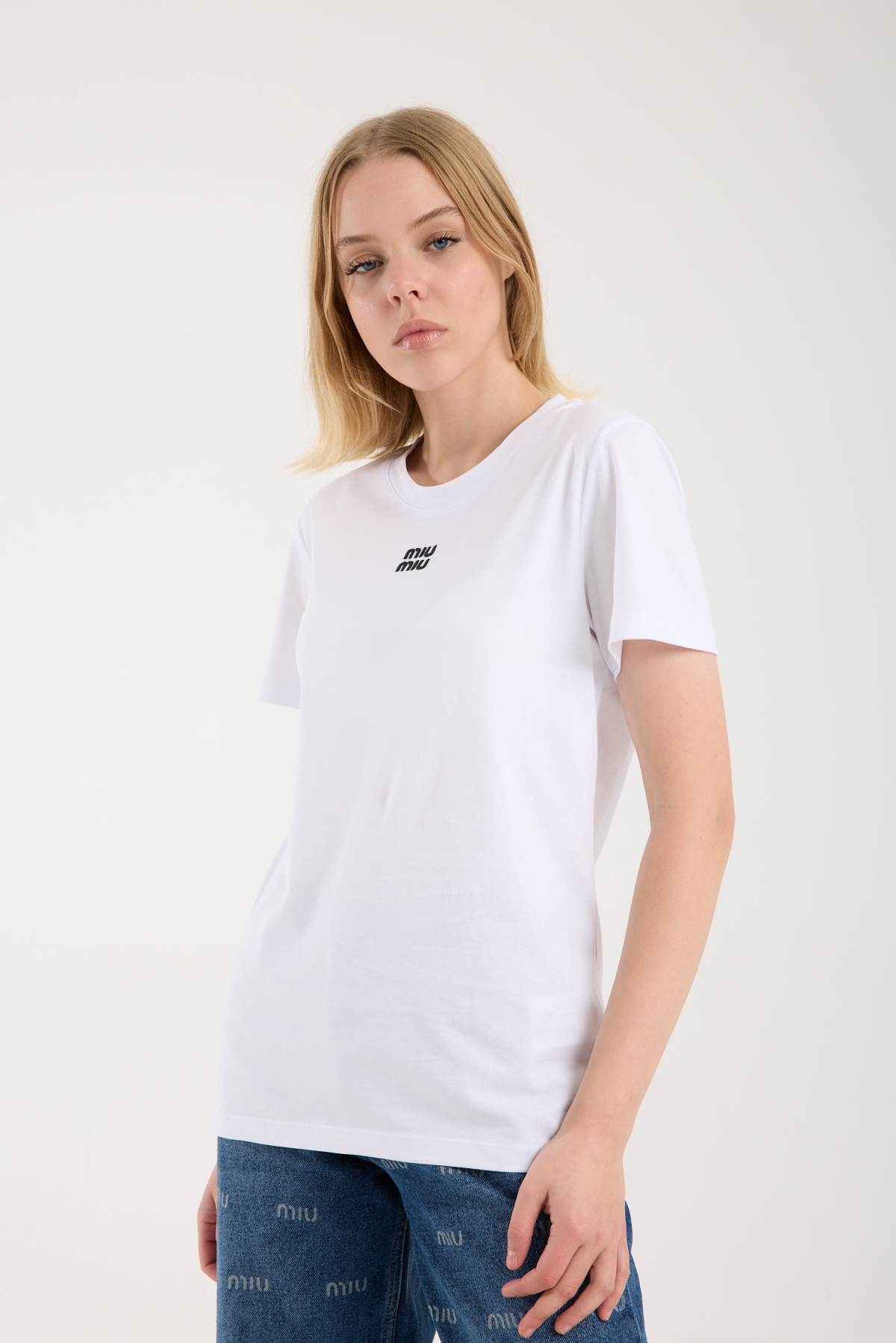 Bisiklet yaka, logo nakış işlemeli t-shirt.